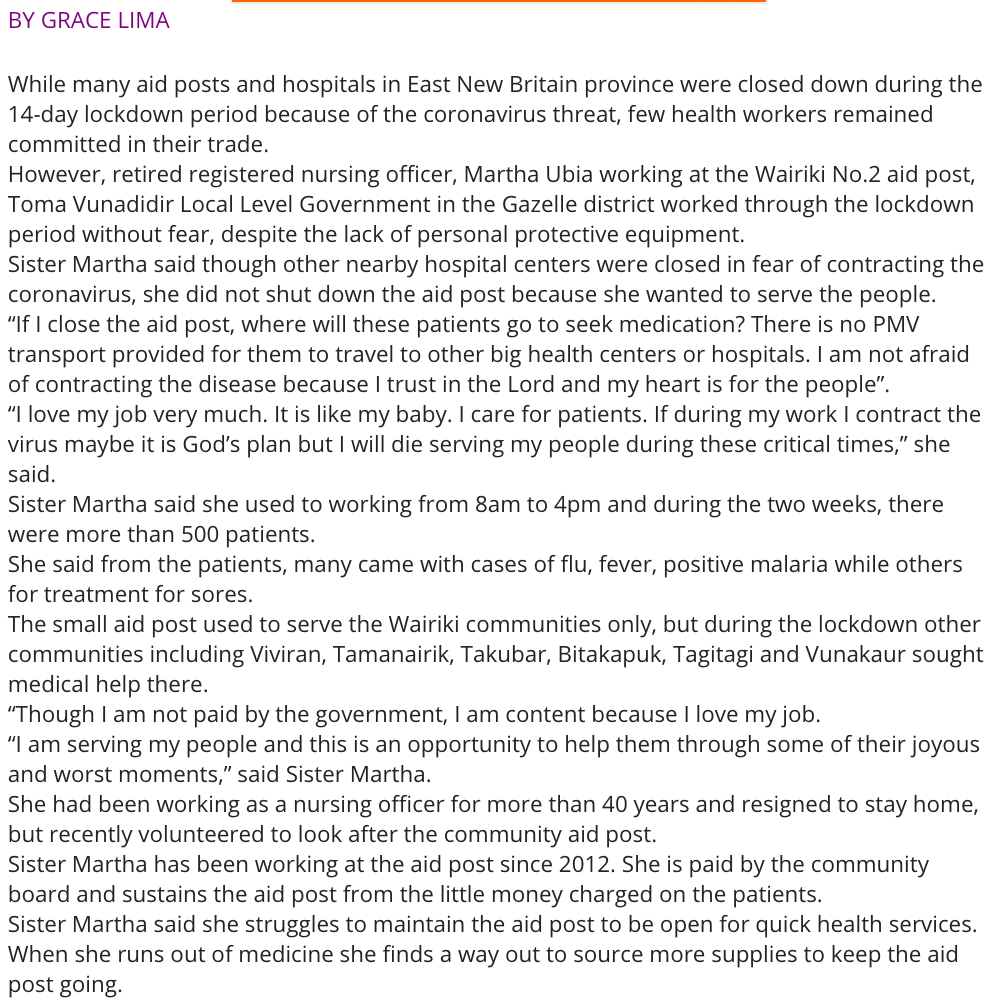 KOKOPO – The first that staff at Nonga General Hospital in Papua New Guinea heard that they had been treating someone with coronavirus, was when they saw the country’s prime minister announce it in televised press conference on Monday. They had been treating the patient, a volunteer health worker at the hospital, for pneumonia. She originally came into the hospital in late March, but recovered and was discharged, before her symptoms worsened and she was readmitted.